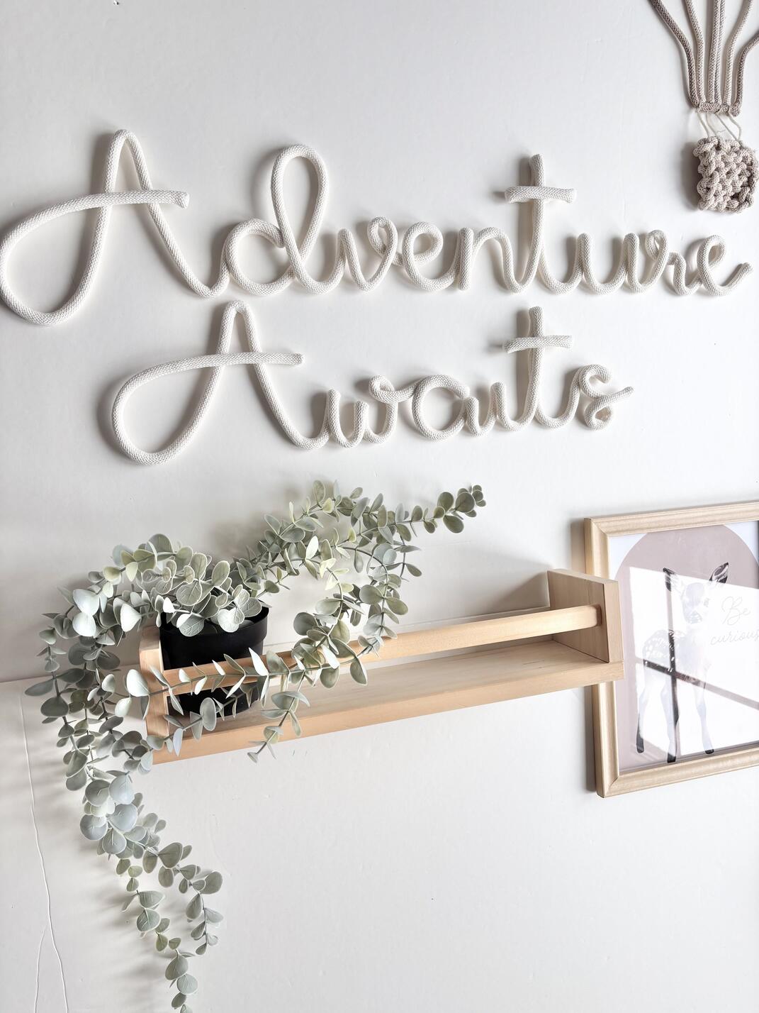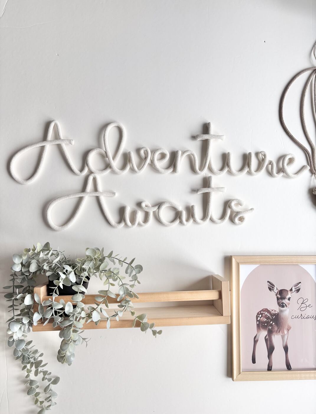 An Adventure Awaits wall sign made from thick cotton rope and sturdy wire, perfect for adding an inspiring touch to kids rooms, playrooms, and nurseries.