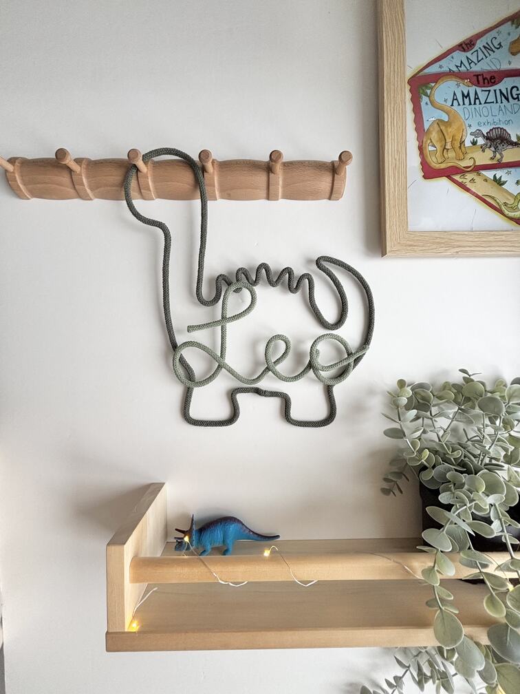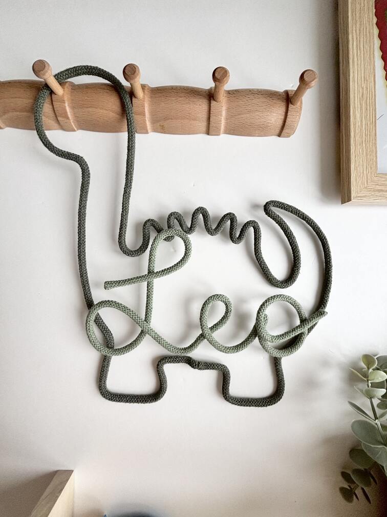 Add a playful and personal touch to your child’s space with this handmade dinosaur wall decor. Featuring a custom name and crafted from rope and wire, it’s perfect for nurseries, playrooms, or dino-themed rooms.