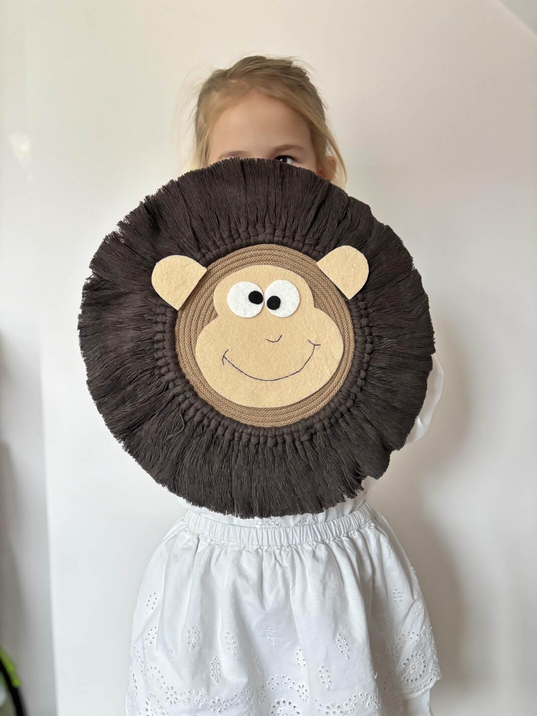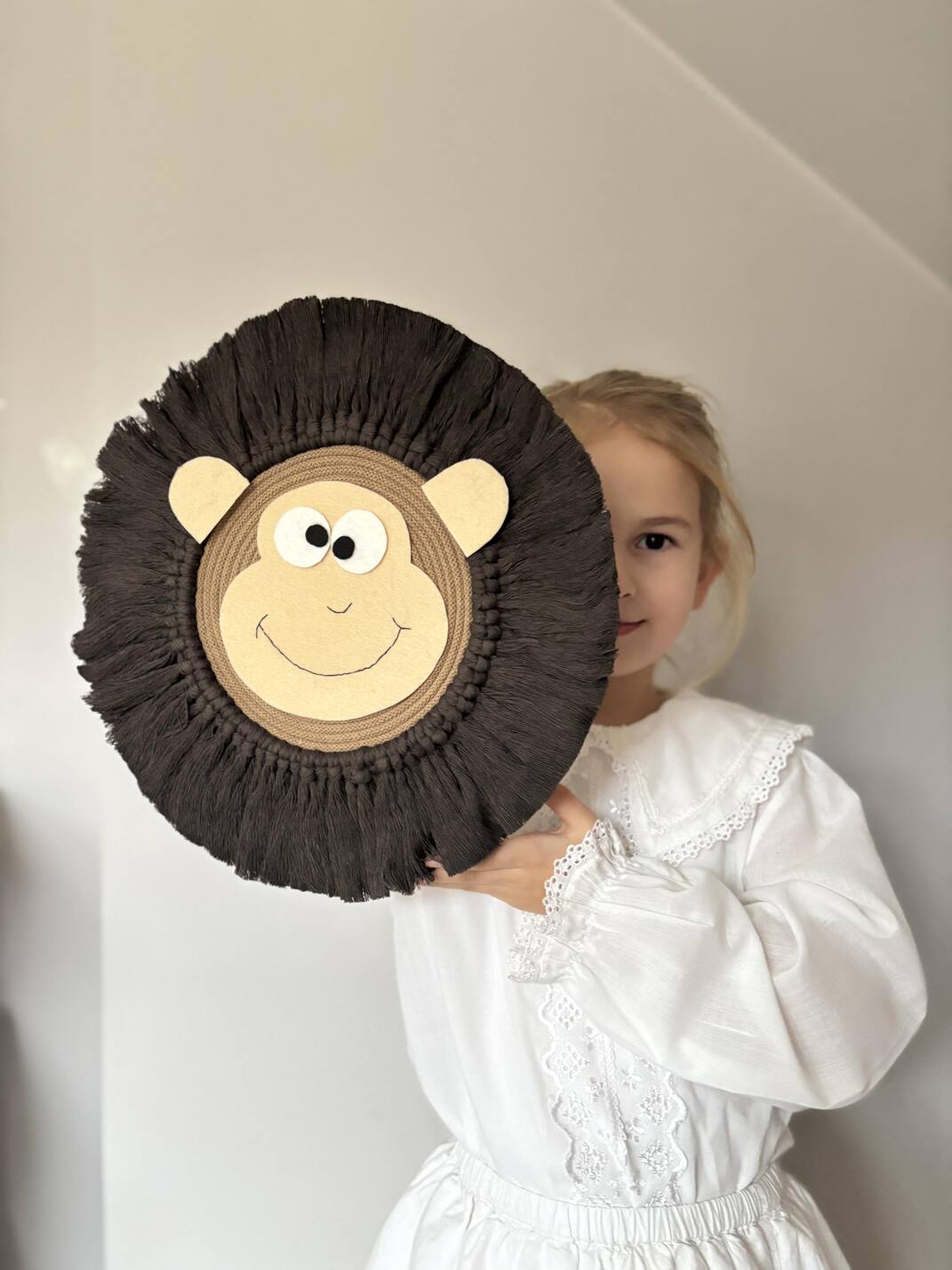 Add a playful jungle touch to your child’s space with this adorable handmade monkey head wall decor. Crafted from cotton, macrame, and felt, it brings warmth, texture, and character to nurseries, kids rooms, or safari-themed spaces.