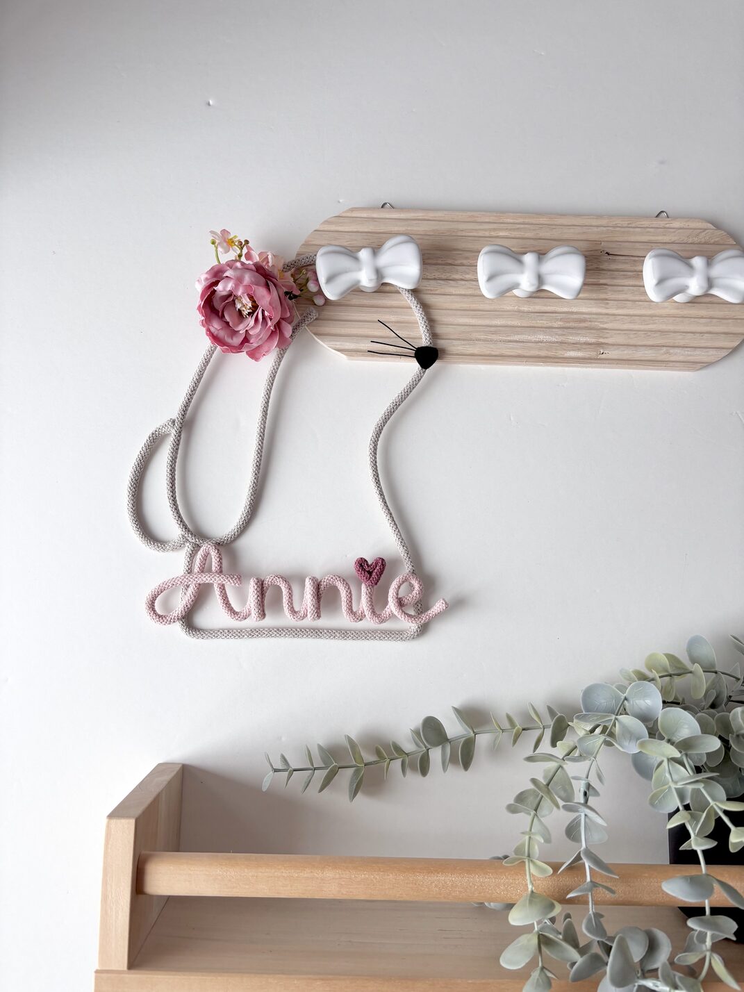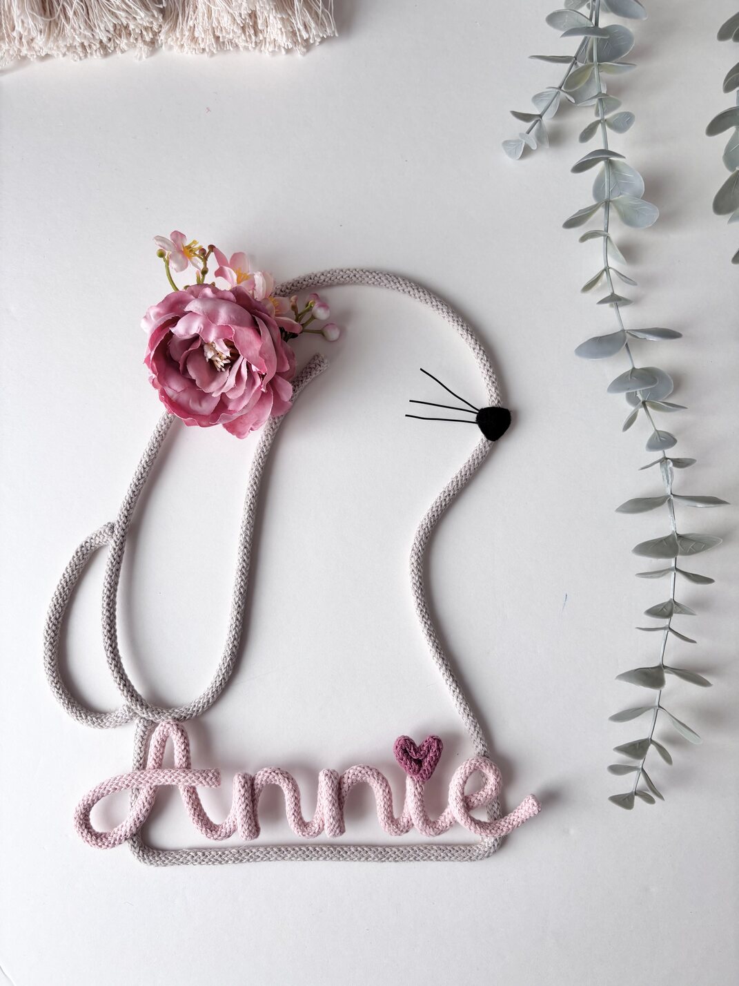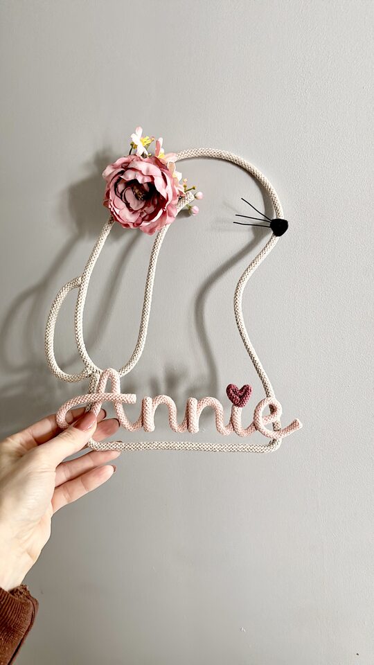 This handcrafted nursery decoration features an adorable bunny made from cotton cord, creating a boho animal nursery decor piece for easter that adds charm to any baby room as a wall hanging. The farmhouse style bedroom accessory makes for a delightful addition to your child’s space, combining functionality with whimsical design perfect for creating a cozy atmosphere.