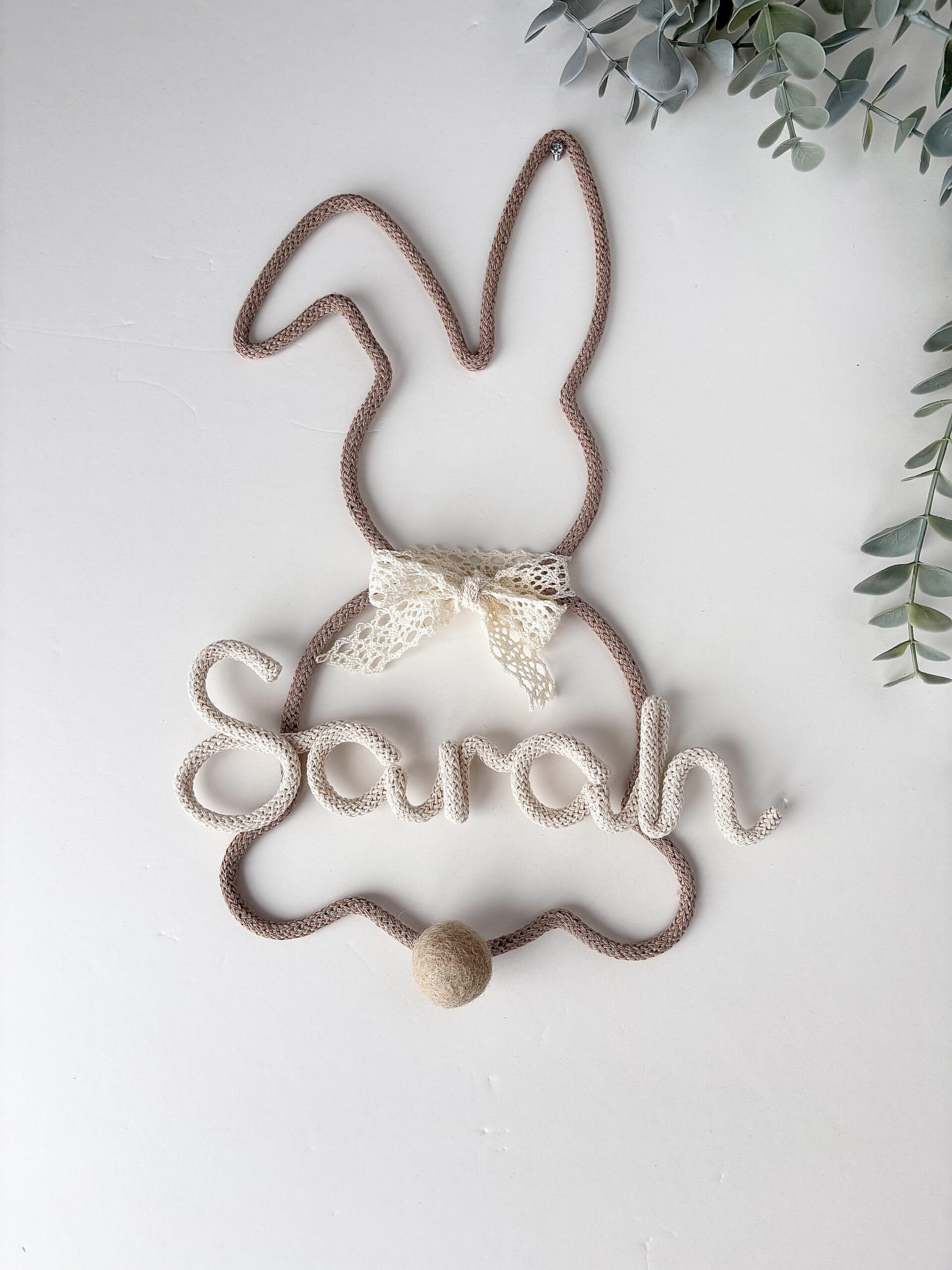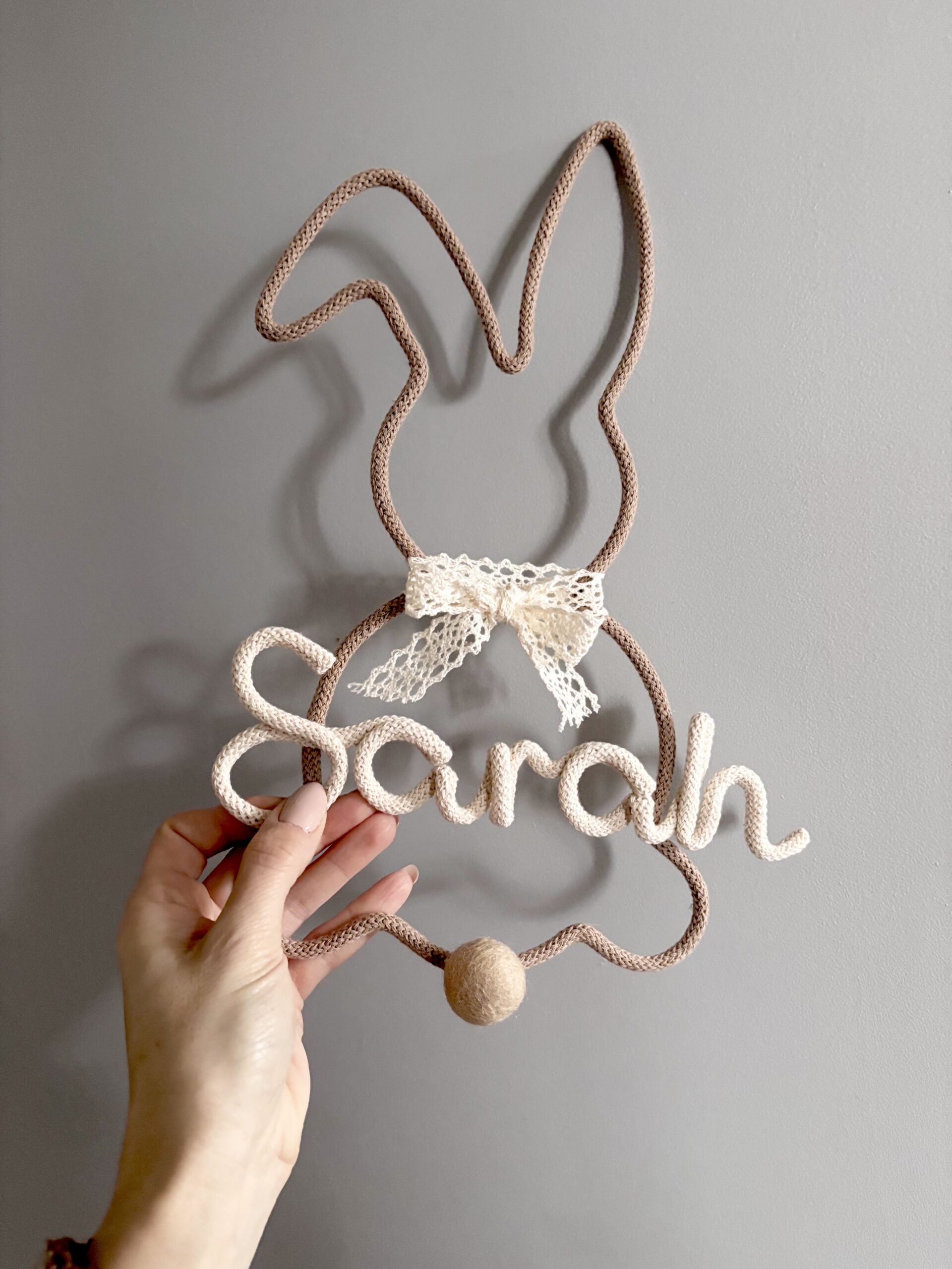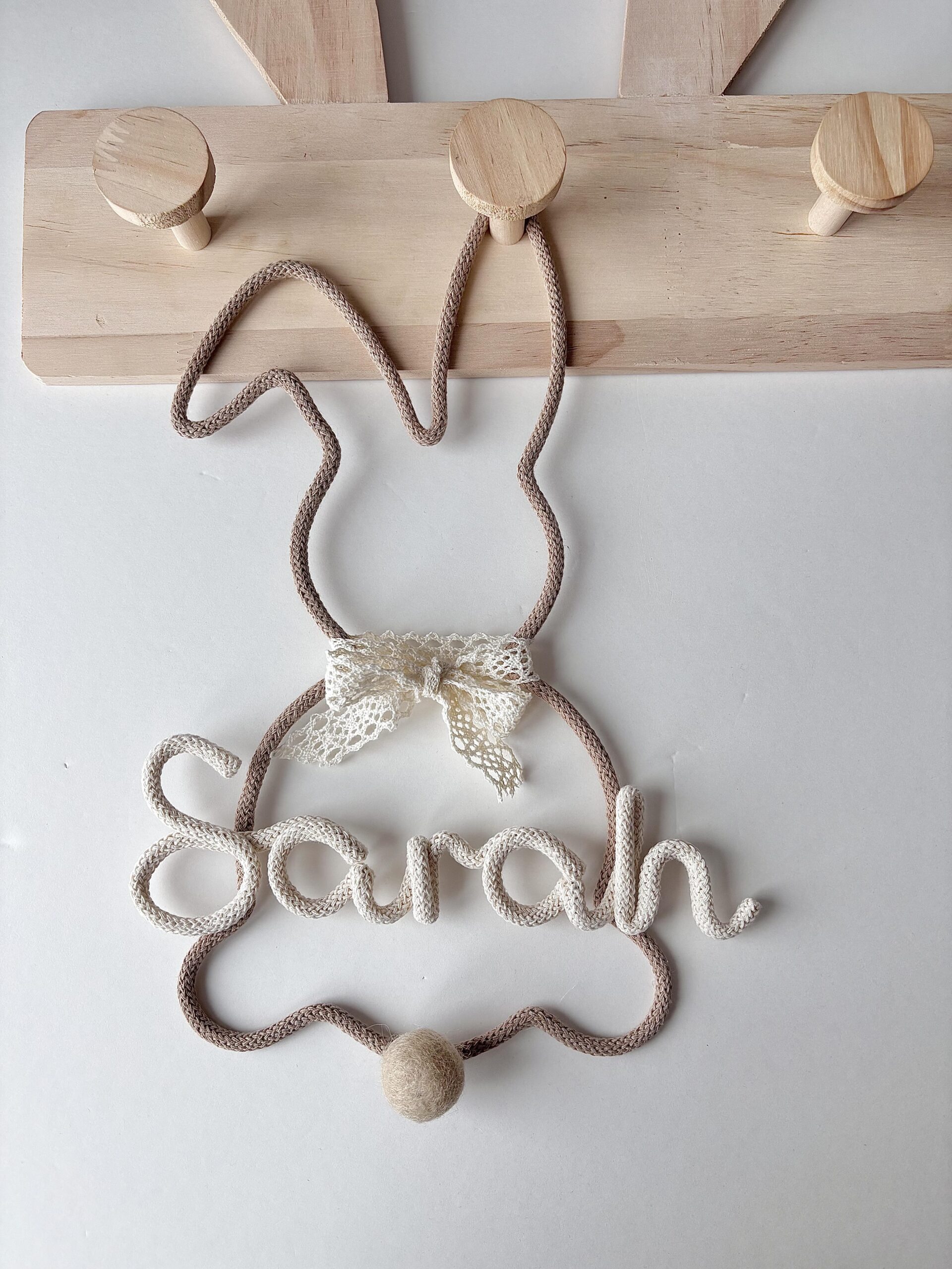 This handmade rabbit wall decoration featuring a delicate lace bow and your child’s name. Designed in beautiful beige and cream neutral tones, this bunny fits perfectly into modern nurseries, baby rooms, and toddler bedrooms.