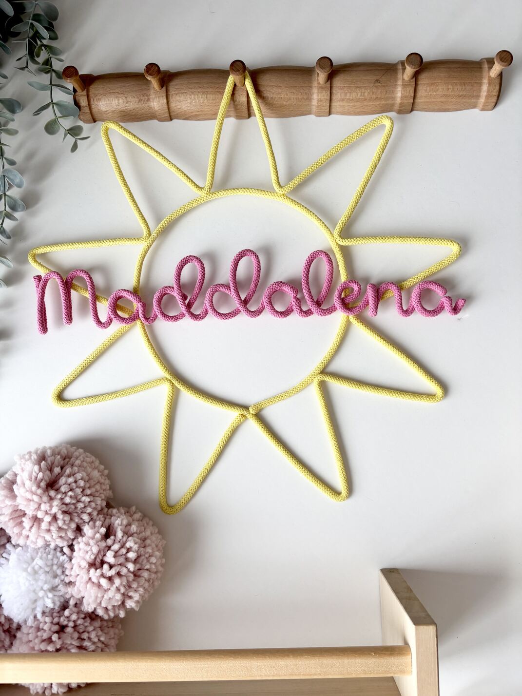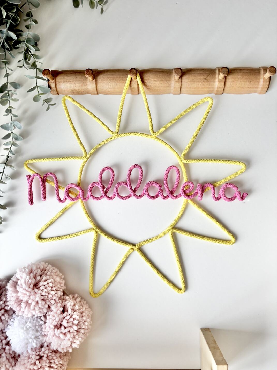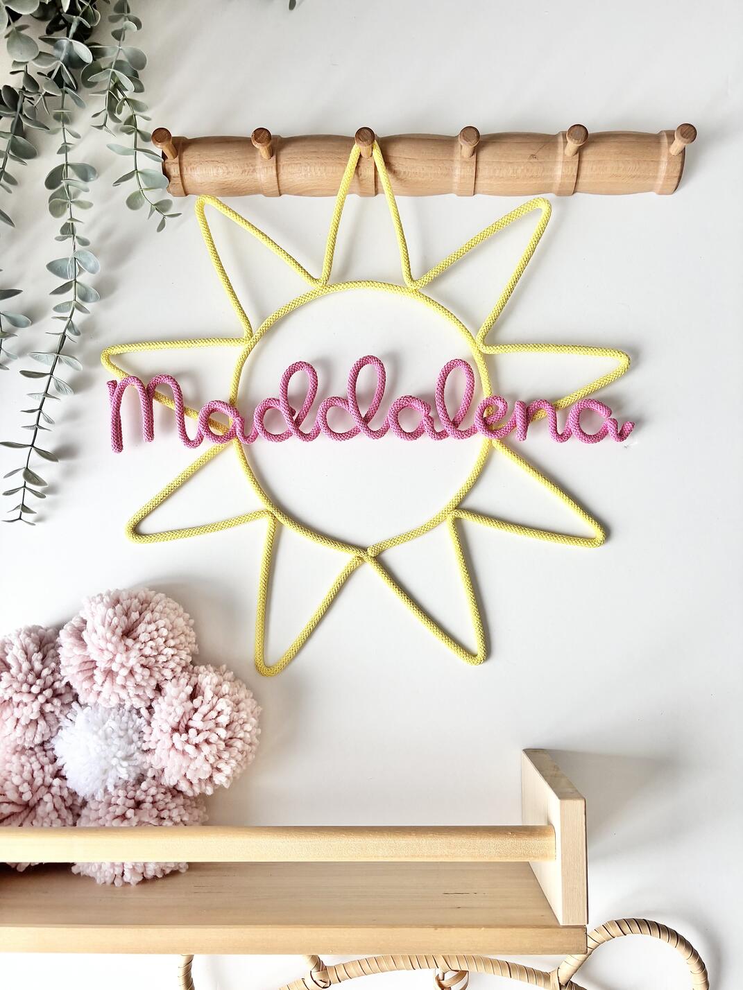 Crafted with soft cotton cord and flexible wire, this charming wall piece is shaped like a sun and customized with any name you choose — perfect for nurseries, kids’ rooms, or as a thoughtful baby shower gift.