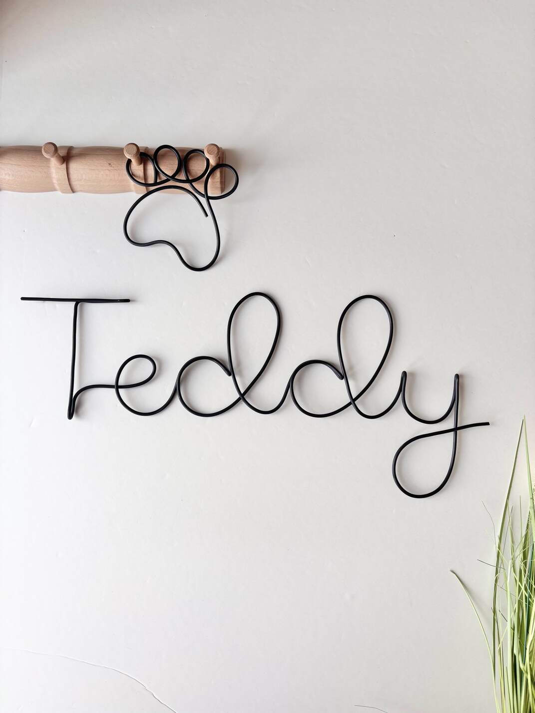 Celebrate your furry friend with this custom handmade dog name sign, crafted from wire and finished with a sweet paw print. A unique and stylish way to personalize your pet’s space or create a meaningful gift.