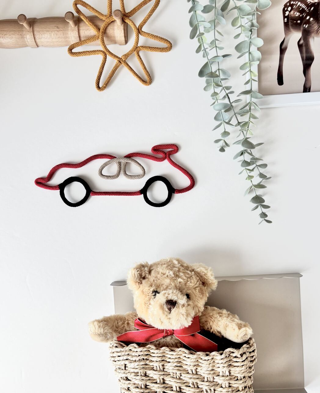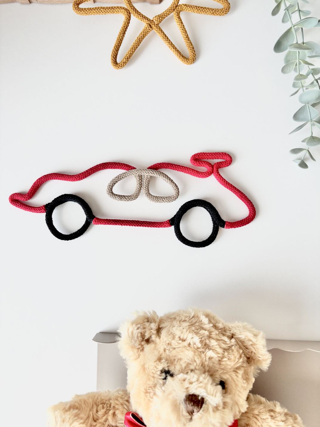 Add a fun and stylish touch to your child’s space with this handmade car wall decor. Crafted from rope and wire, it’s perfect for car-themed nurseries, boys’ bedrooms, or modern kids rooms.