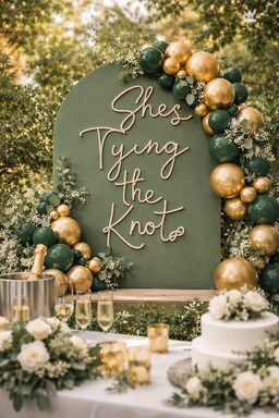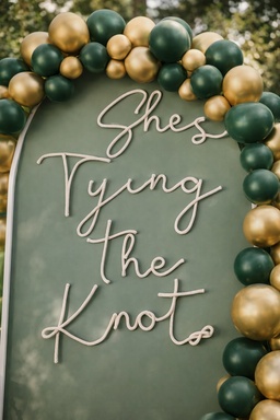 Engagement party photo backdrop with green arch sign “She’s tying the knot”